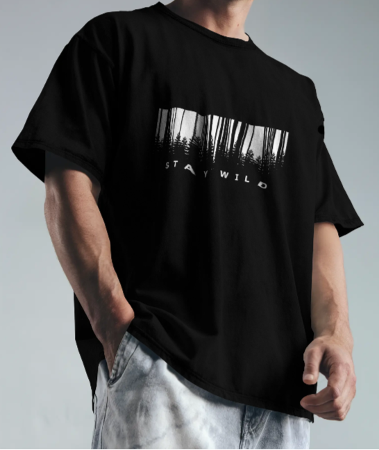 Oversized "Stay Wild" Barcode Forest T-Shirt – Black | Nature-Inspired Streetwear